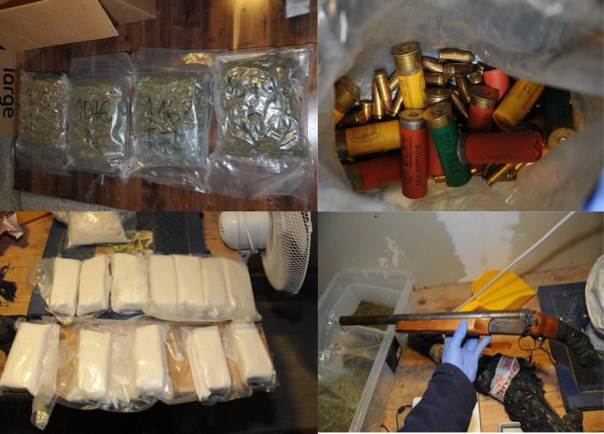 During the search Gardaí recovered large quantities of cocaine and cannabis herb along with an amount of suspected amphetamine. A sawn-off shotgun and large numbers of cartridges and rounds of ammunition were also recovered.