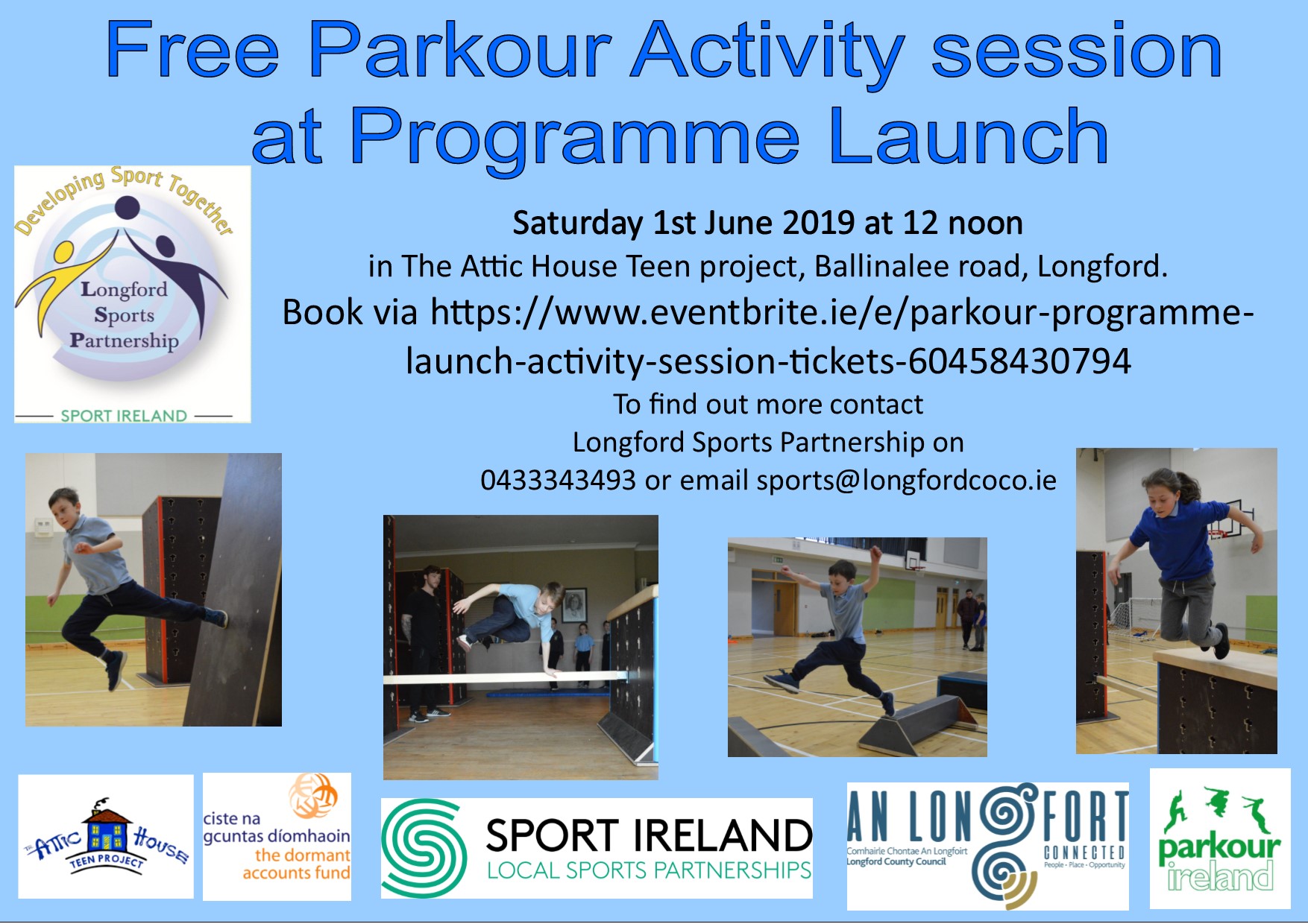 The launch will take place on Saturday, June 1 at 12 noon in Ireland’s first outdoor Parkour park, in the Attic Teen House, Ballinalee Road, Longford, where you can learn from Paul Allen, Ireland’s Got Talent semi finalist and Ireland’s only Parkour Level 2 Coach.
